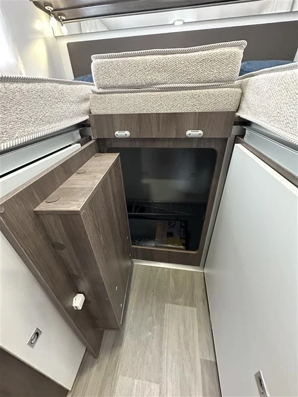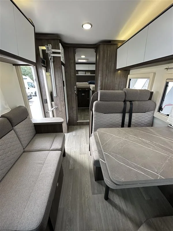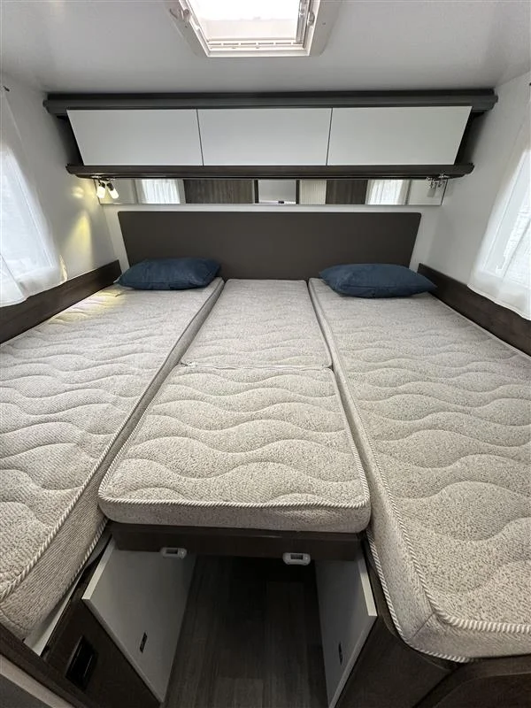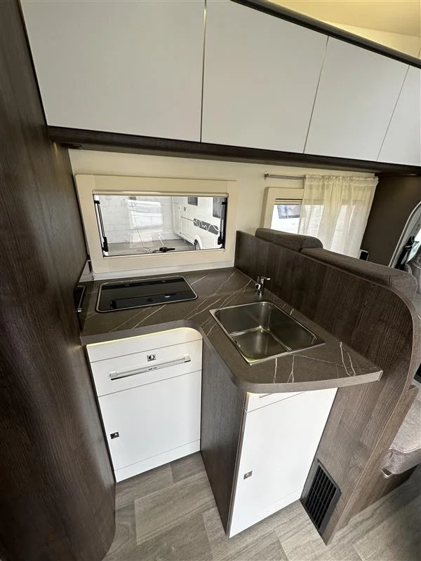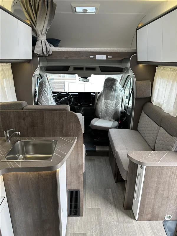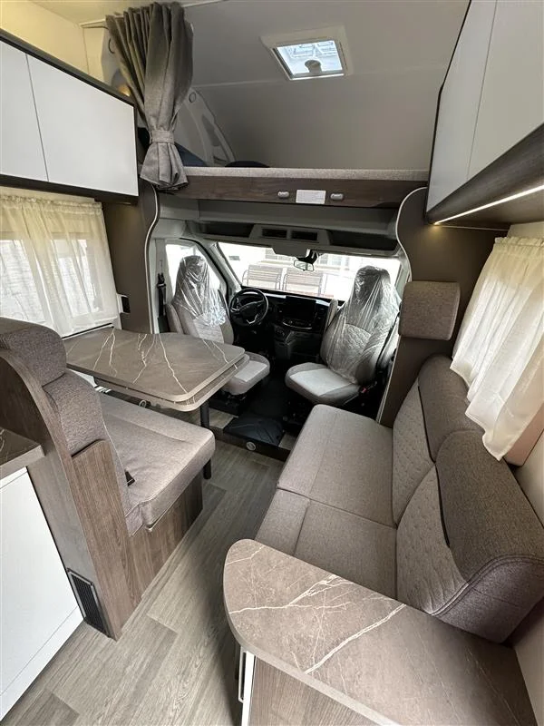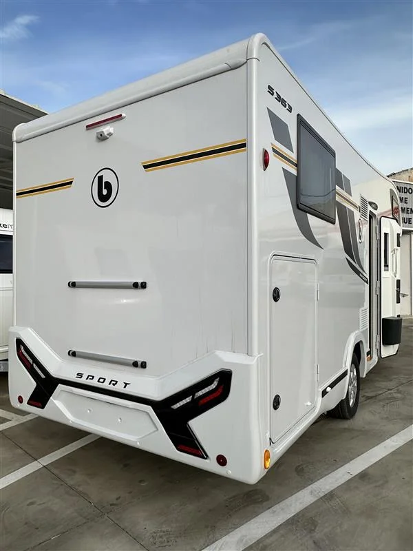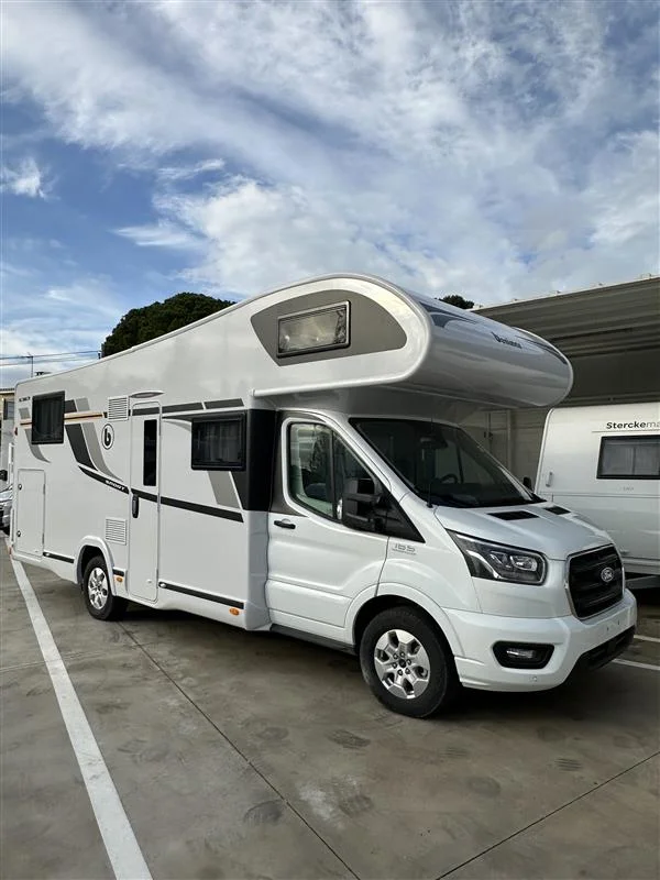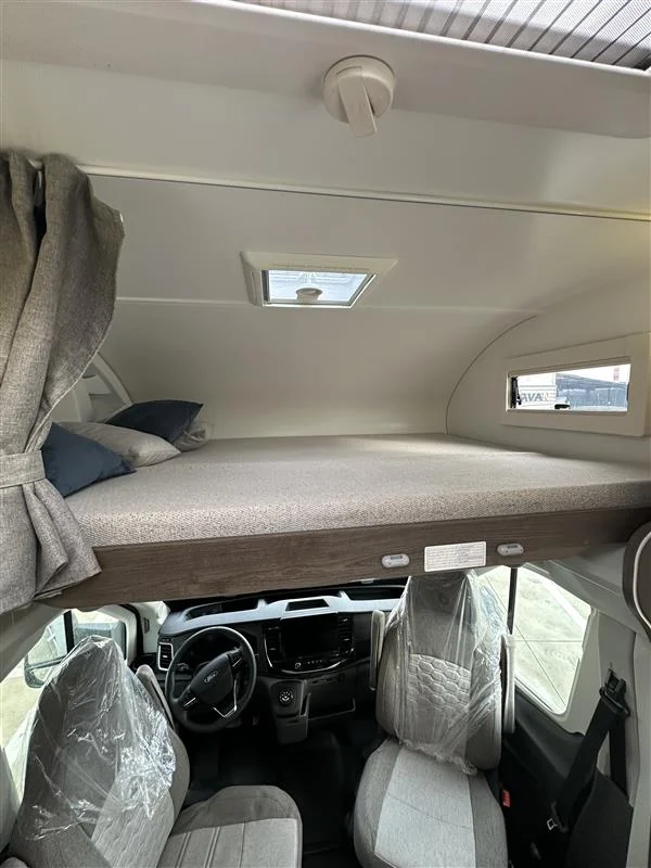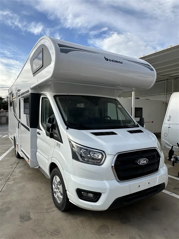 La Benimar Sport S363 es una autocaravana capuchina familiar ideal para viajar en grupo o en familia gracias a sus 5 plazas homologadas para circular, dormir y comer. Equipada con motor FORD Euro 6 de 165 CV y cambio automático, ofrece una conducción cómoda y segura. Su distribución con camas gemelas traseras convertibles y cama capuchina fija maximiza el confort y el espacio interior.