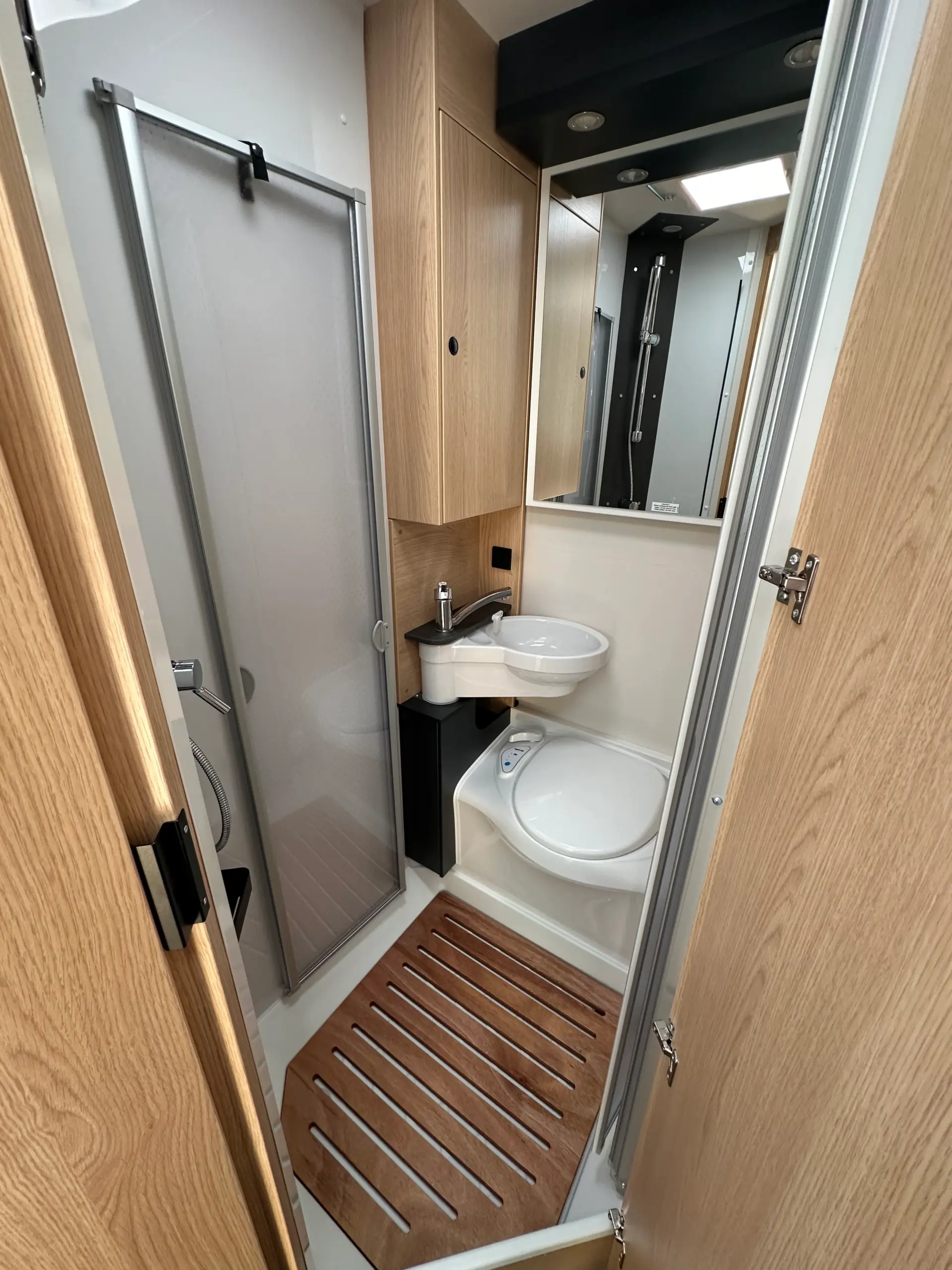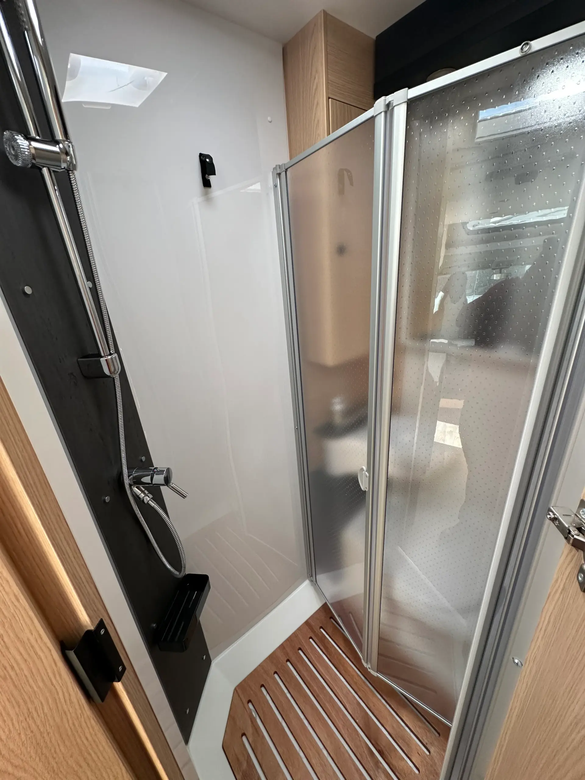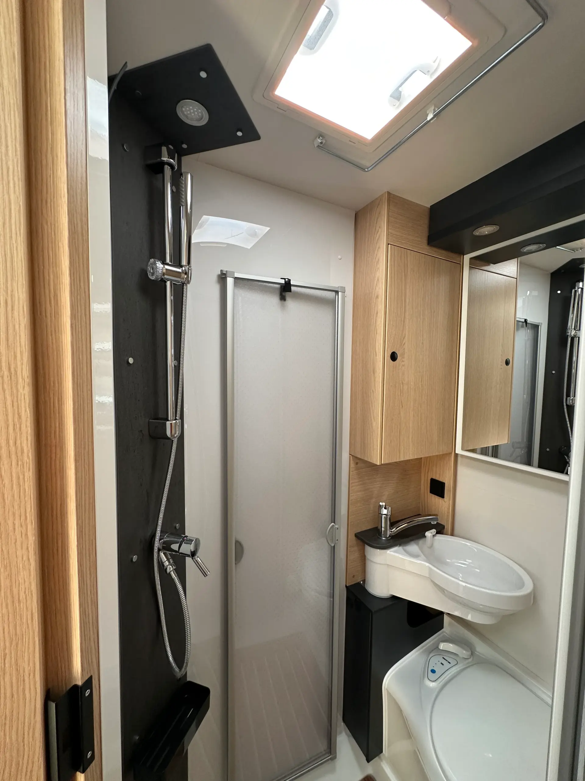 Baño completo con ducha integrada, revestimiento de cabina de ducha, barra perchero, gran espejo.