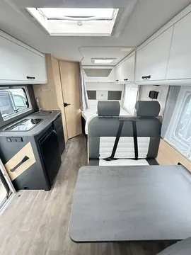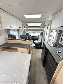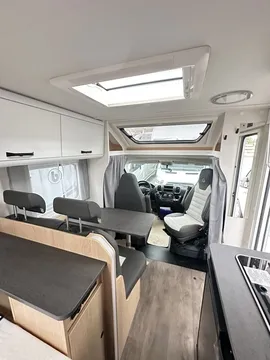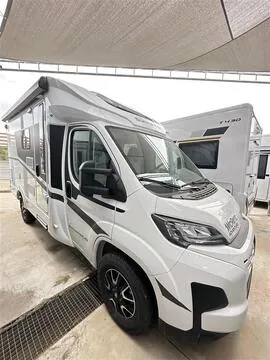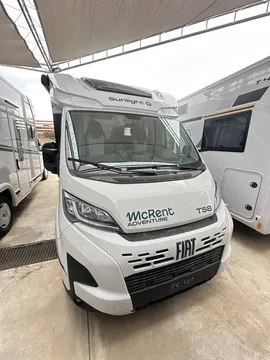 Perfilada Sunlight T 58 Adventure sobre chasis Fiat Ducato 2.2 L con motor 140 CV y cambio manual de 6 marchas. Es una autocaravana compacta de 4 plazas para viajar/dormir y con un diseño práctico y moderno, ideal para viajes en pareja o en familia con distribución funcional y equipamiento Adventure de serie.