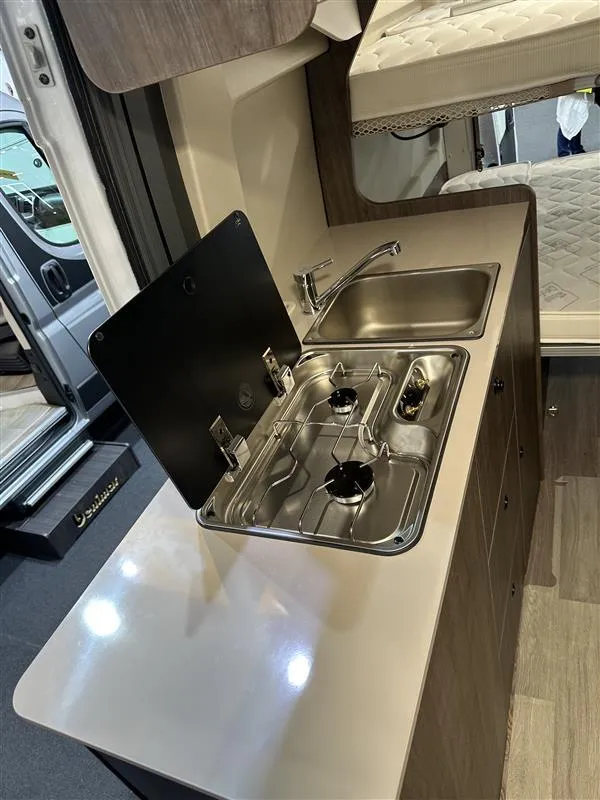 • Fregadero y cocina de 2 fuegos encastrados (según versión estándar)