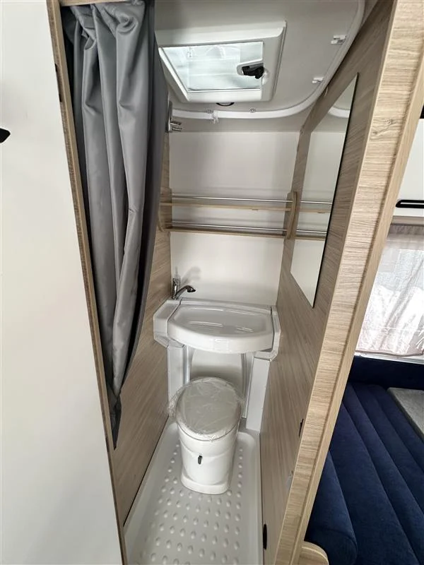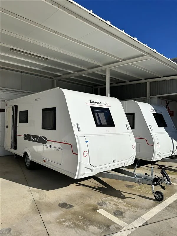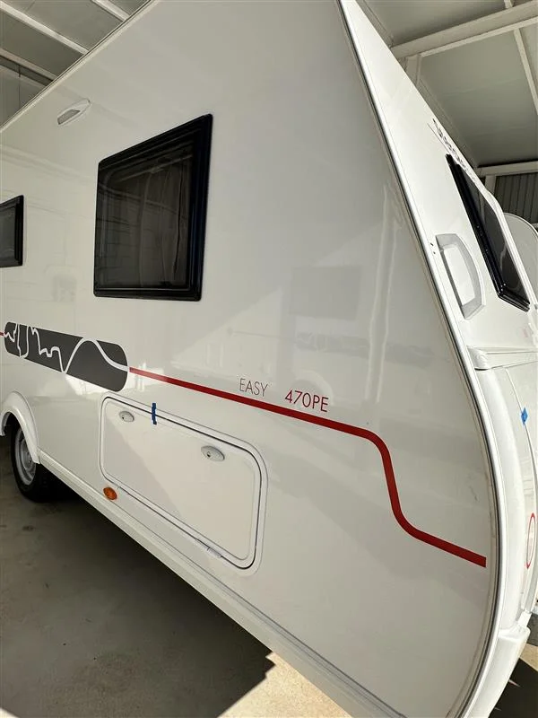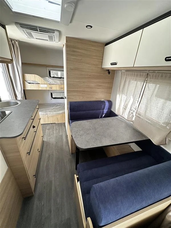 Caravana de remolque Sterckeman Easy 470PE, modelo familiar de 3 ambientes, con capacidad hasta 6 plazas para dormir, aire acondicionado y agua caliente incluidos. Incluido el equipamiento con Pack Safety, Pack Cosy, Pack Shower.