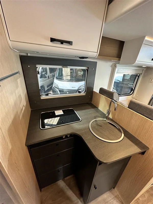 La Sunlight T68 es una perfilada versátil ideal tanto para familias como para grupos de amigos. Con camas gemelas convertibles, cama basculante sobre salón y salón transformable, ofrece hasta 5 plazas de dormir y de viaje. Montada sobre chasis Fiat Ducato 140 CV, cumple normativa Euro 6. Dispone de aseo independiente, cocina completa con horno, calefacción Truma Combi, y un salón amplio con multimedia y TV. Además, incluye toldo, portabicis y cámara, todo ello con acabados de calidad, techo GRP y extras del paquete Adventure.